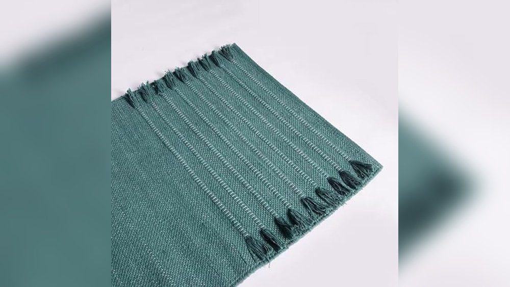The Jaipur Art & Rugs Organic Cotton Yoga Mat is a thoughtfully hand-woven rug designed to enhance your fitness routine. Made with superior cotton weave and eco-friendly materials, it offers a non-slip, thick surface measuring 24 by 72 inches, perfect for yoga, Pilates, or stretching exercises at home. Its dark green color and artisanal craftsmanship bring a natural, comfortable feel to your workout space.