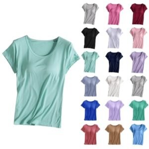 Short sleeve yoga tops for women with built-in bras and underwire offer comfort and support in one piece. These tops